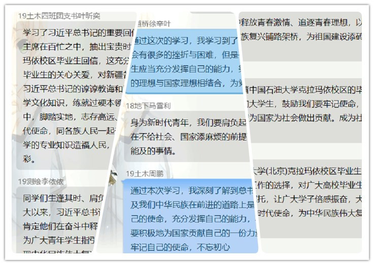 本网讯 为鼓励青年学生们勇担重任、积极上进。7月18日-7月22日,土木学院通过线上网络会议的方式,组织各班级同学学习了习近平总书记给中国石油大学(北京)克拉玛依校区毕业生的回信。同学们感触颇深,相继发表了自己的学习感悟。