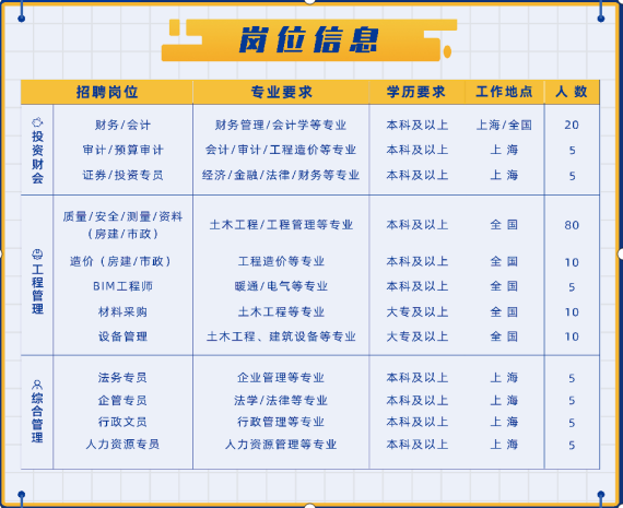 三、招聘专业 土木类:土木工程、工程管理、给排水科学与工程等; 建筑类:工业与民用建筑; 金融学类:金融学、投资学(投资管理); 法学类:法学; 管理科学与工程类:信息管理与信息系统、工程管理、工程造价; 工商管理类:会计学、财务管理、税务管理、人力资源管理、市场营销、审计学。 四、薪酬福利待遇 1.薪酬待遇(岗位工资+地区津贴): 一本院校:6300-6800元税前/月 二本院校:5500-6000元税前/月 2.假期待遇。职工享受的假期包括享受带薪年休假、调休假、婚假、产假、护理假、公益假、哺乳假、计划生育假、工伤假、病伤假、丧假、事假及其他国家法定节假日休假权利。 3.福利待遇。单位为职工缴纳“五险一金”,即:养老保险、医疗保险、失业保险、工伤保险、生育保险、住房公积金。 4.持证津贴。对考取国家相关的执业资格证书和岗位证书给予持证津贴,其中一级建造师津贴4-6.5万元/年,岗位证书、职称证书,给予1000-6000元/年不等的津贴。 5.其他福利待遇。餐补、单人间宿舍(项目部)、通讯补贴、夏令用品、节日福利、体检、团队拓展等。 五、员工培养和晋升 1.员工职业生涯规划。实施员工职业生涯规划,畅通员工职业发展通道, “师带徒”培养模式,充分发挥多方的联动作用规范加速职业人才培养,构建员工职业转换、轮岗机制,帮助员工实现自我价值提升超越。 2.职务晋升。按照操作序列、专业序列、管理序列等不同管理方向晋升。 3.职称晋升。单位具有国家授权的工程系列中级职称评审权。本科毕业生毕业5年可申报中级、毕业10年申报高级、毕业15年申报正高级职称,硕士研究生毕业1年申报中级、毕业6年申报高级、毕业11年申报正高级职称。 六、招聘时间及地点 2020年 9 月 17 日(周四) 15:00 在 逸夫楼5121多媒体教室 举行专场招聘宣讲会,宣讲会现场可直接投递简历,后经筛选通知面试,部分专业安排笔试。面试及笔试合格后签订就业协议。 七、其他事项 1.应聘学生在招聘现场提供以下资料:个人简历、就业推荐表、学习成绩单原件、各类获奖证书复印件等。 2.应聘学生也可将个人简历、就业推荐表、学习成绩单及各类获奖证书扫描件等通过邮件发送到公司邮箱。 3.联系方式: 联系地址:上海市静安区寿阳路99弄8号楼 联系人:姜女士/张女士 联系电话:021-65032295/021-65428005 简历投递邮箱:campus@lycg.com.cn