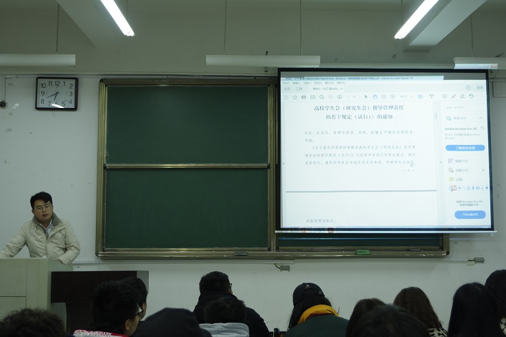 会议伊始,张浩同学带领全体工作人员学习了全国学联二十七大会议精神,就全国学联第二十六届委员会工作报告、《中华全国学生联合会章程》、《关于学联学生会工作人员改进作风服务同学的若干规定》以及《关于落实共青团和学联对高校学生会(研究生会)指导管理责任的若干规定》进行了深入学习。 随后,张浩同学以“如何做好一名学生干部”为题,从学生会与学生干部的定位、掌握工作方法和培养工作思想三个方面进行了分享交流。张浩同学结合自身工作经验和日常工作案例,具体明白的阐述了基本工作方法,并对活动开展、办公技能和能力培养等方面进行了深入交流。最后,与会同学就日常工作中的问题、经验和心得进行了交流讨论。