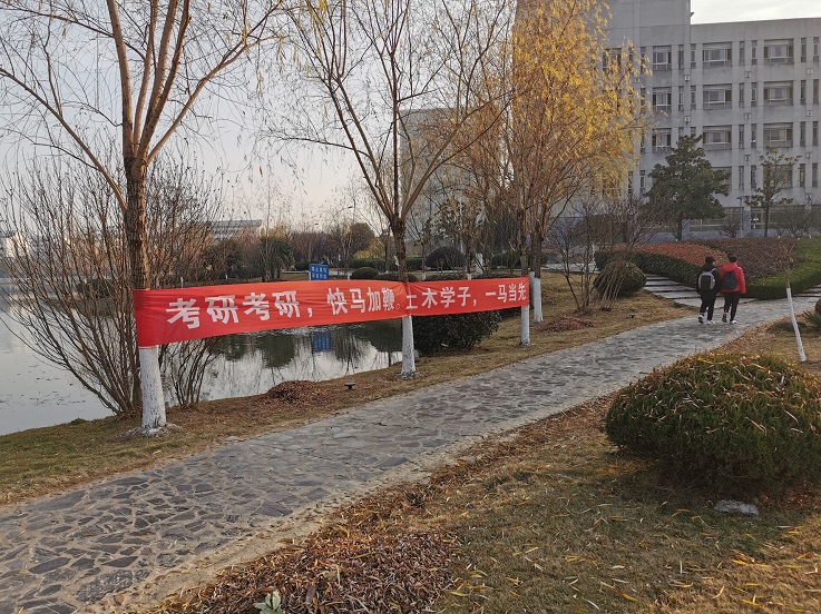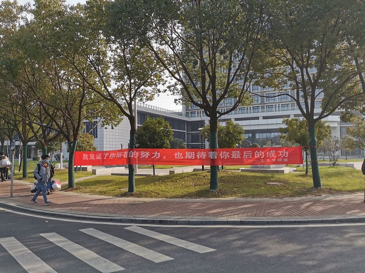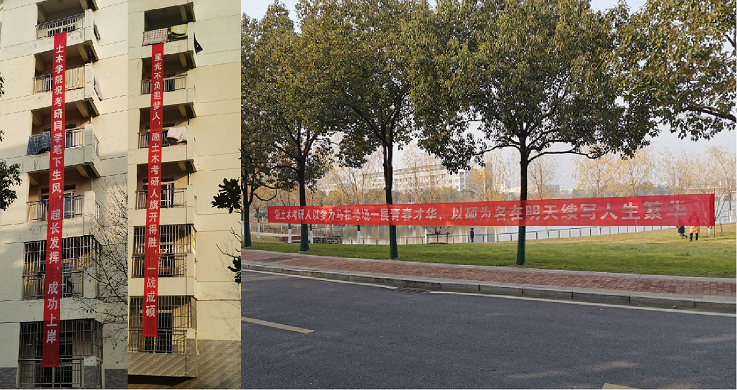 经过层层筛选,得到了最终的“冠军选手”。这些真挚的祝福分别被悬挂在大学生活动中心、南食堂、北食堂门口,图书馆门口等地,希望他们在接下来的考试中成竹在胸,旗开得胜,稳定发挥、取得理想的成绩。