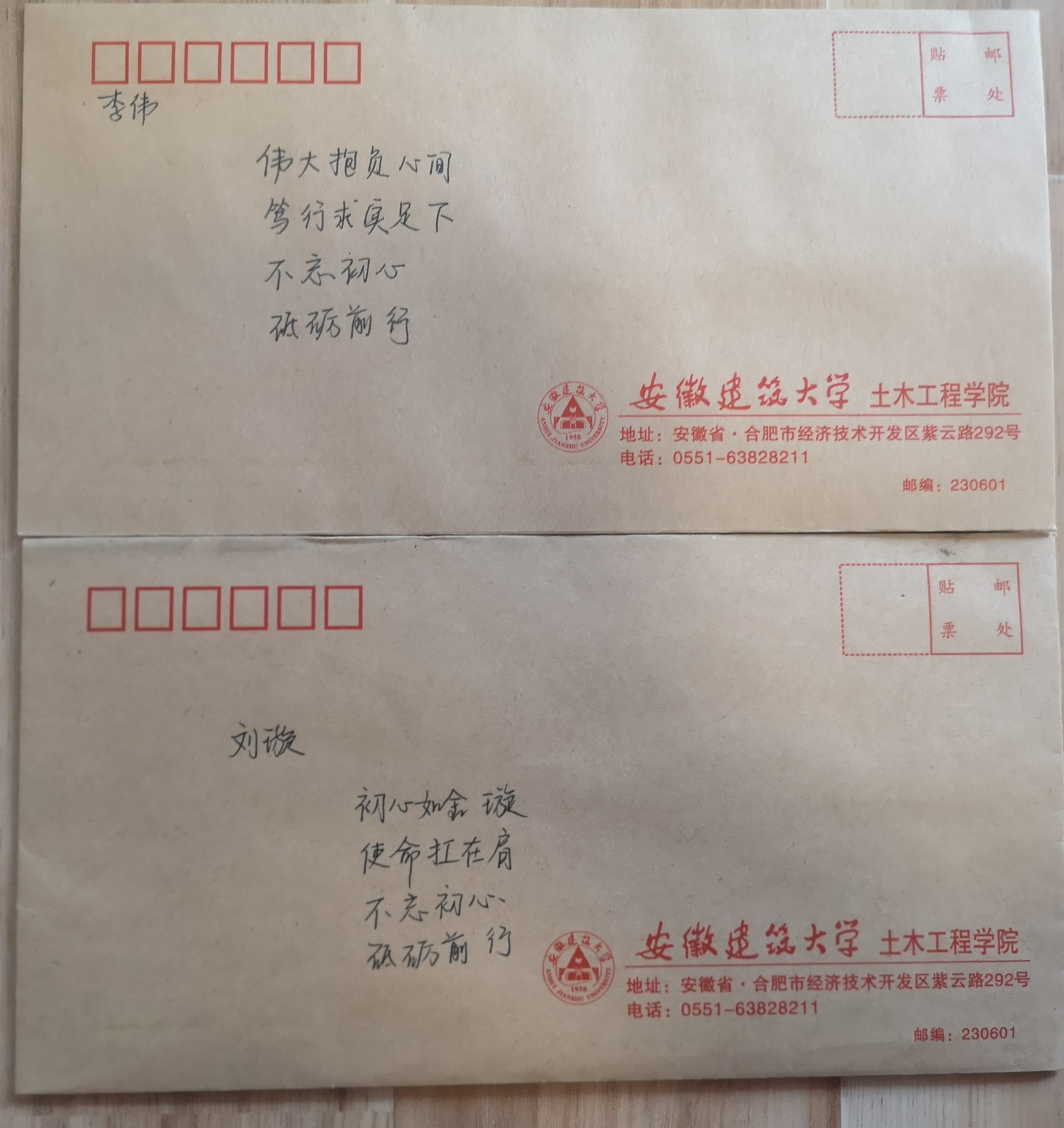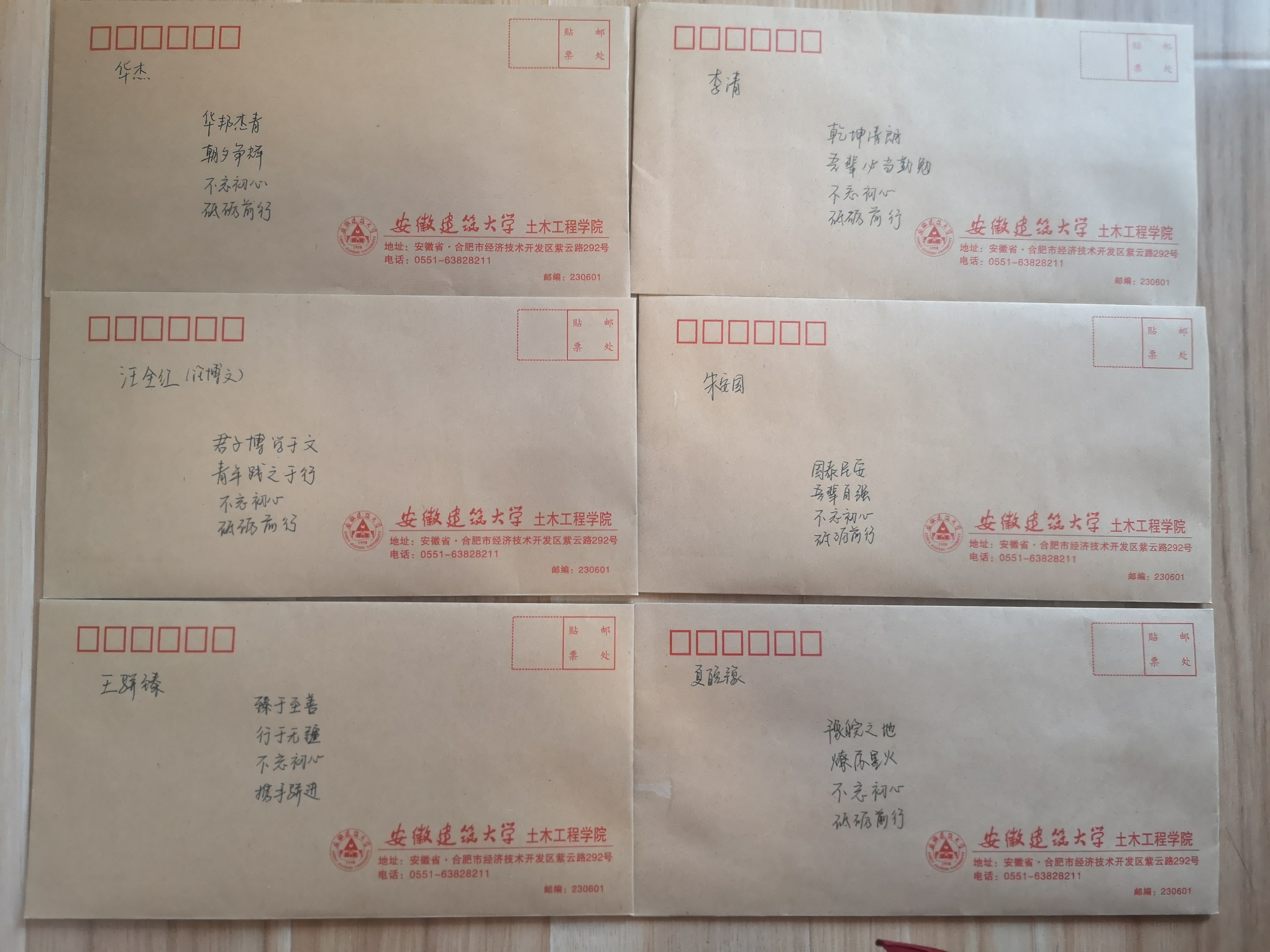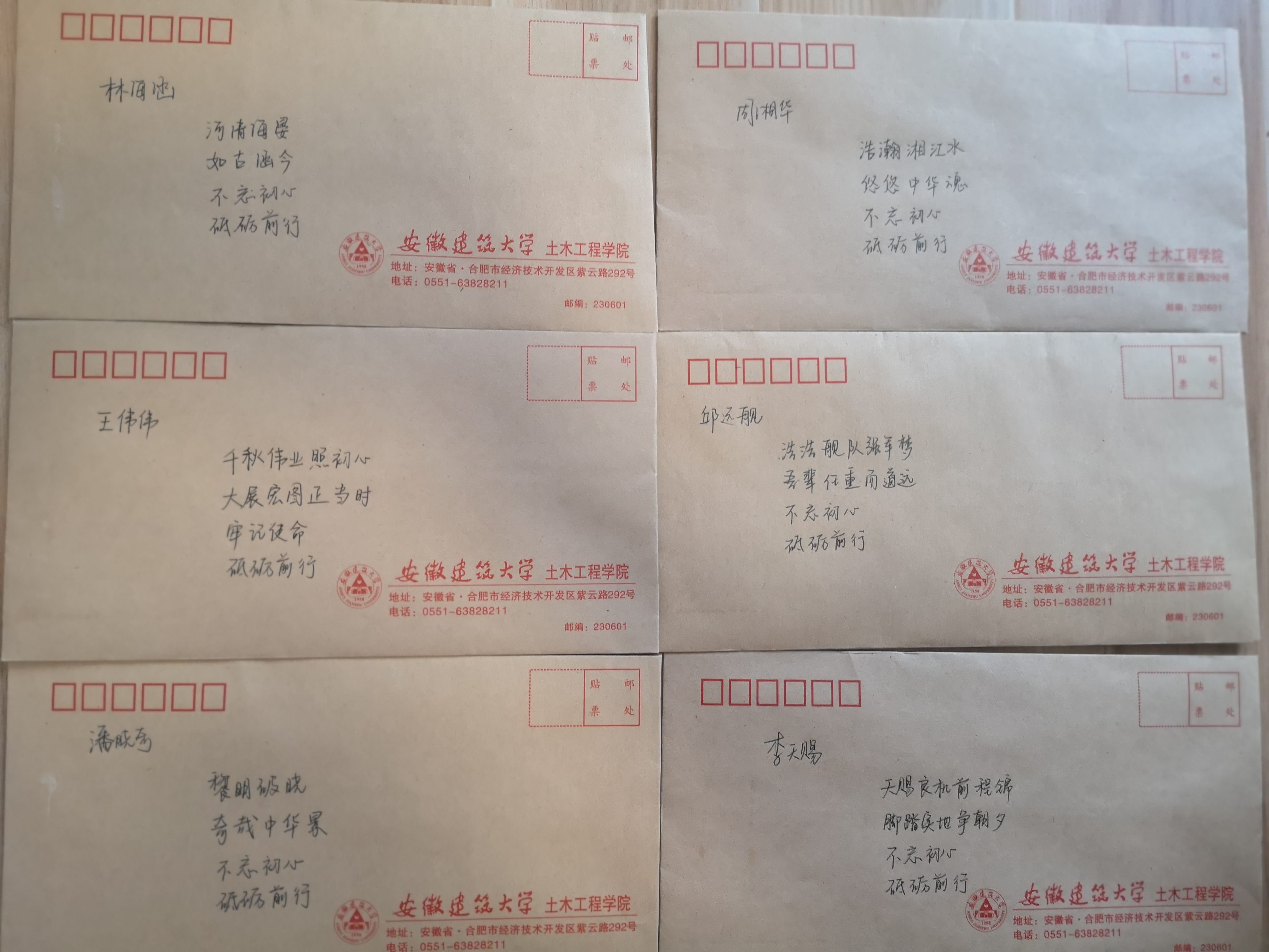 本网迅 开展入党发展对象教育工作是党员发展工作的重要环节,对入党发展对象提高认识、增强素质、端正动机有着重要的作用。近日,土木学院学生党支部创新形式开展发展对象教育工作,书写寄语送给发展对象。 “以汝之名,书写寄语”,是将发展对象的名字融入到寄语之中,以提醒他们不忘初心,端正入党动机,激励他们将“小我”融入“大我”,不断增强思想自觉和行动自觉。安全工程学生党支部、测绘工程学生党支部等支部充分利用发展对象政审契机,支部书记在装有组织外调函的信封上认真书写寄语。例如寄语17安全潘晓奇同学:“黎明破晓,奇哉中华景!不忘初心,砥砺前行!”寄语17安全汪博文:“君子博学于文,青年践之于行。不忘初心,砥砺前行!”寄语17测绘王骈臻:“臻于至善,行于无疆。不忘初心,携手骈进!”寄语17测绘朱安国:“国泰民安,吾辈自强。不忘初心,砥砺前行!”以汝之名,书青春华章!以汝之名,树奋斗形象!
