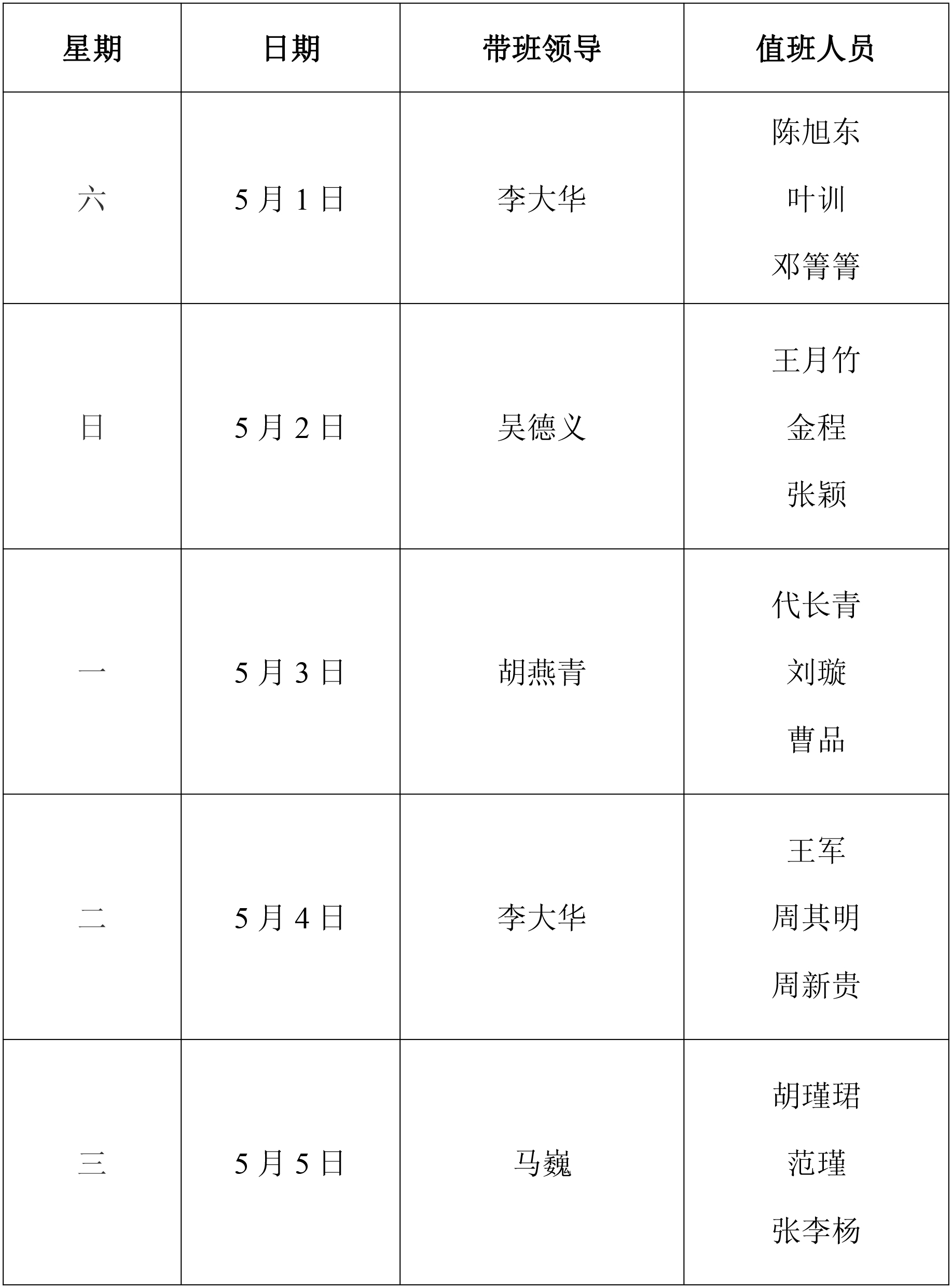 为确保学校安全形势持续稳定,落实假期期间安全工作部署,土木工程学院“五一”期间值班安排如下: