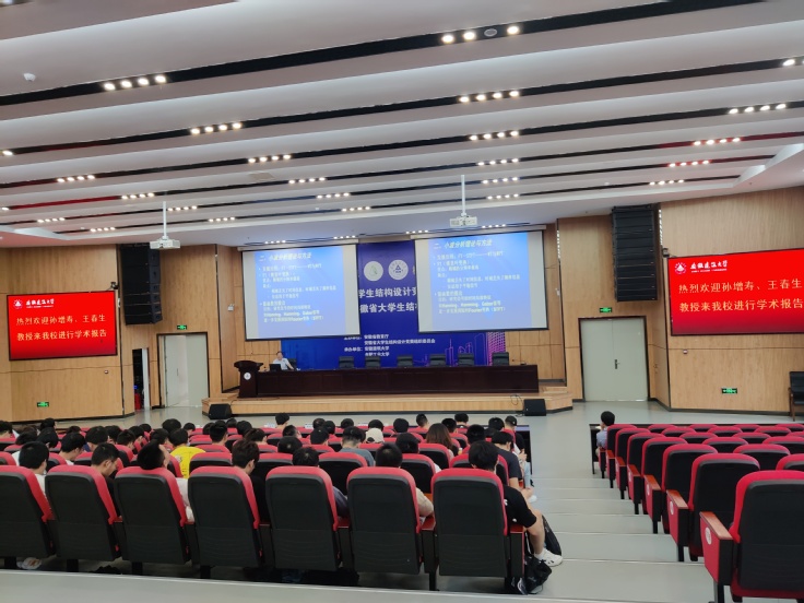 随后,孙增寿教授和王春生教授在综合实验楼二楼报告厅分别做了“基于小波的桥梁结构损伤识别”和“UHPFRC组合加固新技术及应用”为主题的学术报告,报告会由土木工程学院院长吴德义主持,学院相关专业任职教师与研究生、本科生听取了报告。孙增寿教授为我校师生系统的介绍了小波分析理论及其在结构损伤识别、损伤定位和损伤程度确定中的应用,并对今后的研究进行了讨论和展望。王春生教授结合工程实际,对研究使用UHPFRC材料应用于组合加固技术做了系统的报告。与会期间,两位教授与我校师生开展了热烈的讨论,并为到会师生答疑解惑。