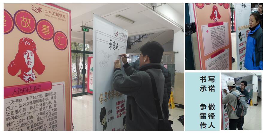 3月12日下午,志愿者们在大学生活动中心集结,他们自带毛巾、扫帚、拖把等清洁用具,对宿舍楼道,自行车棚等地进行清洁、整理,用事迹行动践行“弘扬雷锋精神,展示青春风采”的宗旨。志愿者们热情高涨,活动过程中也有其他同学主动加入,他们捡拾楼道死角的垃圾、整理车棚停放车辆,努力维护着干净、整洁的校园环境。20交通1班的志愿者史青城说:“在这次志愿活动中,大家团结合作,通过一点一滴的小事,搭砌志愿奉献的金字塔,以自身行动传承雷锋精神,我们新时代的青年应该主动向雷锋同志学习,做一颗永不生锈的螺丝钉,凝聚起共建文明校园、共创美好生活的强大正能量。” 书写承诺,争做雷锋传人 雷锋精神,永不褪色,雷锋精神的种子深深埋在大学生心中。3月16日下午,土木学院在食堂、宿舍楼等地摆放雷锋事迹和雷锋名言的展板,引导学生从自己做起、从身边做起、从小事做起、从现在做起,学习雷锋精神,成为有理想、有道德、有文化、有纪律的中国特色社会主义建设者和接班人。