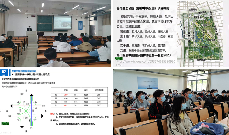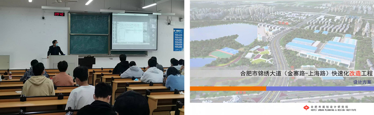 最后,浦玉炳以合肥市骆岗生态公园庐州大道工程为案例对象,从项目的整体概况、总体方案及投资估算三个方面,为同学们做了生动、具体的介绍。浦玉炳从园区功能需求、周围环境协调等因素介绍合肥市庐州大道工程的设计考量,并通过多方案对比,向同学们介绍了方案设计的思路,引导同学们将所学理论知识与工程实践相结合。