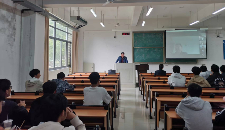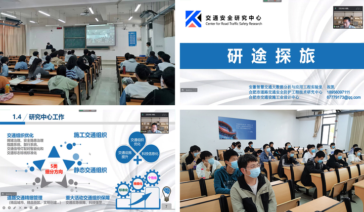 本网讯 5月1日,土木工程学院道路与桥梁工程系通过线上线下方式在逸夫楼同步举行了线上实习暨系列学术讲座活动,讲座由土木学院石贤增教授主持,道桥系部分教师、2018级毕业班及其他年级同学参加会议。 活动邀请到合肥市规划设计研究院总工程师黄从俊教授级高工、安徽庐峰交通科技有限公司副总经理祝凯研究员、合肥市市政设计研究总院有限公司副总工浦玉炳教授级高工,作为本次学术讲座的主讲嘉宾。土木学院副院长马巍代表学院出席讲座活动并发言,他首先对本次出席讲座的专家表示欢迎,接着对参加线上实习的同学们提出学习要求,希望同学们能够通过此次讲座,进一步巩固所学,开拓眼界,扎实完成实践学习任务。