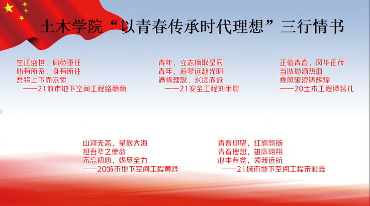 编者按:在新时代,美育既有对自然美的欣赏,也有对人格境界道德美的追求,还有对中国历史进程中精神美的弘扬,更有对红色文化内涵理想美、信仰美的坚守。习近平总书记指出:“人民有信仰,国家有力量,民族有希望。”这是对美育的清源正本。 本网讯 习近平总书记在全国教育工作会议上指出,我们的教育方针是培养德智体美劳全面发展的社会主义建设者和接班人。他特别强调,要全面加强和改进学校美育,坚持以美育人,以文化人。土木学院高度重视学生美育教育,也在不断探索工科学生审美和人文素养提升新途径,举办各类学生美育文化活动,以期达到育人心灵的根本宗旨。 美育与德育融合,厚植家国情怀 将美育教育与社会主义核心价值观教育相融合,通过美育和课程思政落实立德树人根本任务,深入挖掘美育活动的思政元素和活动内容的育人价值。坚持美育与德育融合,厚植学生家国情怀。 学院开展“以青春传承时代理想”三行情书、“新入团团员集体诵读‘习近平与大学生朋友们’”、“‘悦’读经典,‘疫’路书香”征文、“‘青’音传史,‘易’心向党”配音等活动,通过读原著、学原文、悟原理,选取经典红色电影片段配音等,引导新时代大学生在新时期不忘初心,以文化提升素养、以知识开拓视野,从而培养浓厚的文化气息。