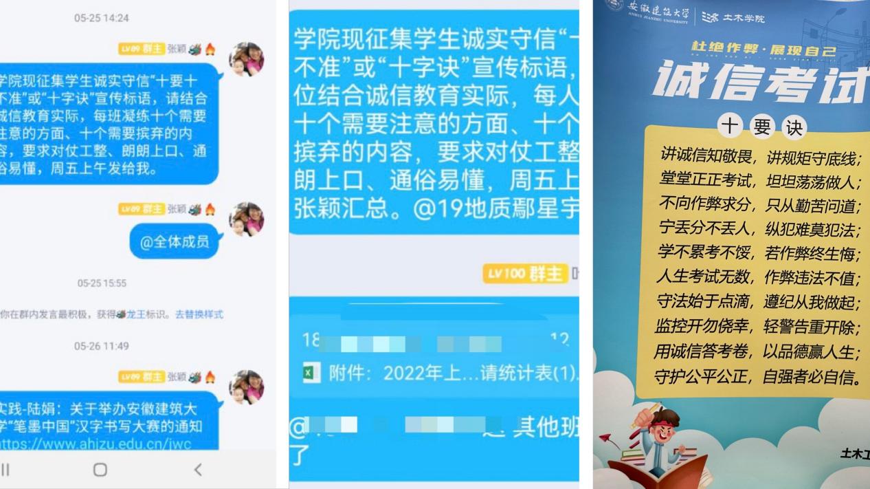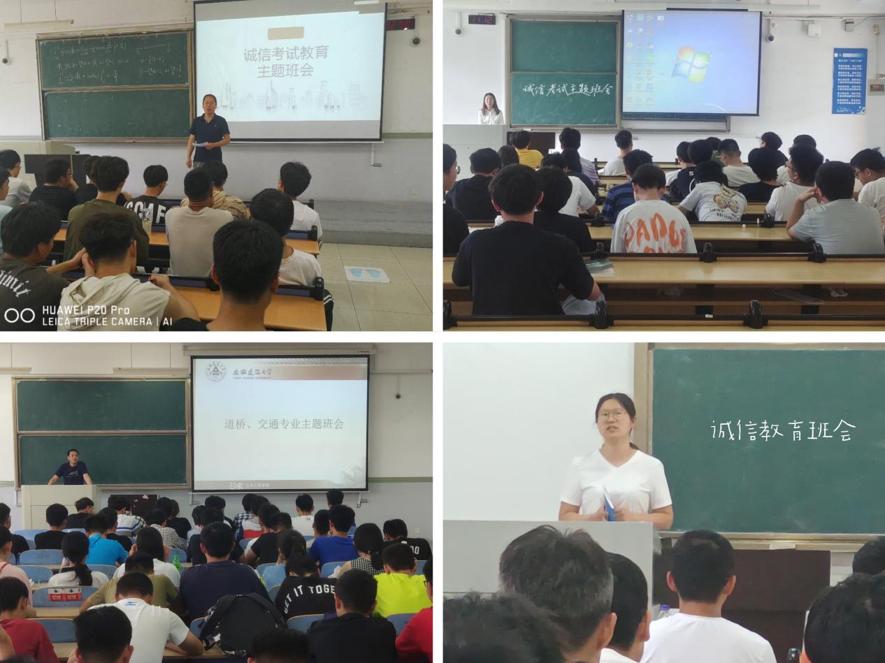 辅导员们分专业、分班级开展诚信考试主题班会,借传统典故传达诚实守信的重要性,并带领大家学习了《安徽建筑大学学生违纪处分实施办法》和《安徽建筑大学普通高等教育(学分制)学士学位授予细则》中关于考试违纪的有关规定,同时将学校学生考试作弊的相关处分文件进行宣读,以此警示大家严于律己,严守考纪,树立“做人在于诚,考试在于真”的正确考试观,考出真实水平,考出真才实学,考出诚信学风。