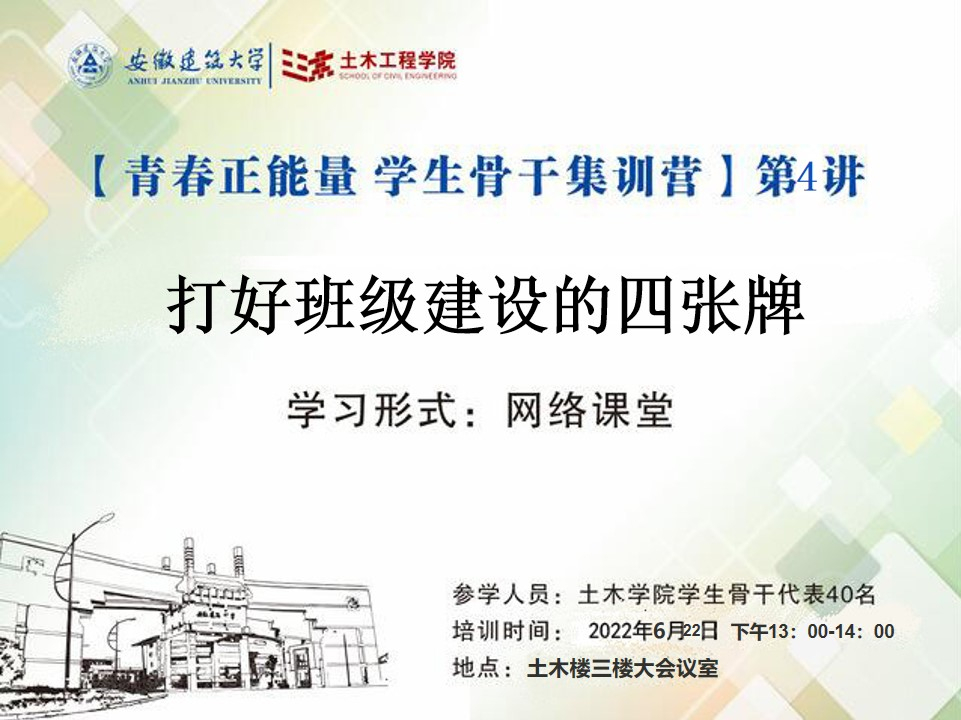 编者按:今年是党的二十大召开之年,也是共青团建团100周年,为深入贯彻落实习近平总书记关于青年工作重要论述精神,进一步强化青年学生的思想引领,切实将青年工作抓实、抓细、抓具体、抓出成效,土木学院特推出“青春正能量 学生骨干集训营”专题培训活动,旨在搭建青年学生骨干学习、锻炼、展示平台,通过抓好“关键少数”带动“绝大多数”,教育引导广大学生增强中国特色社会主义道路自信、理论自信、制度自信、文化自信,高扬理想风帆,厚植爱国情怀,把爱国情、强国志、报国行自觉融入到实现中华民族伟大复兴的奋斗中,以一往无前的姿态展现土木学子风采,喜迎党的二十大胜利召开。
