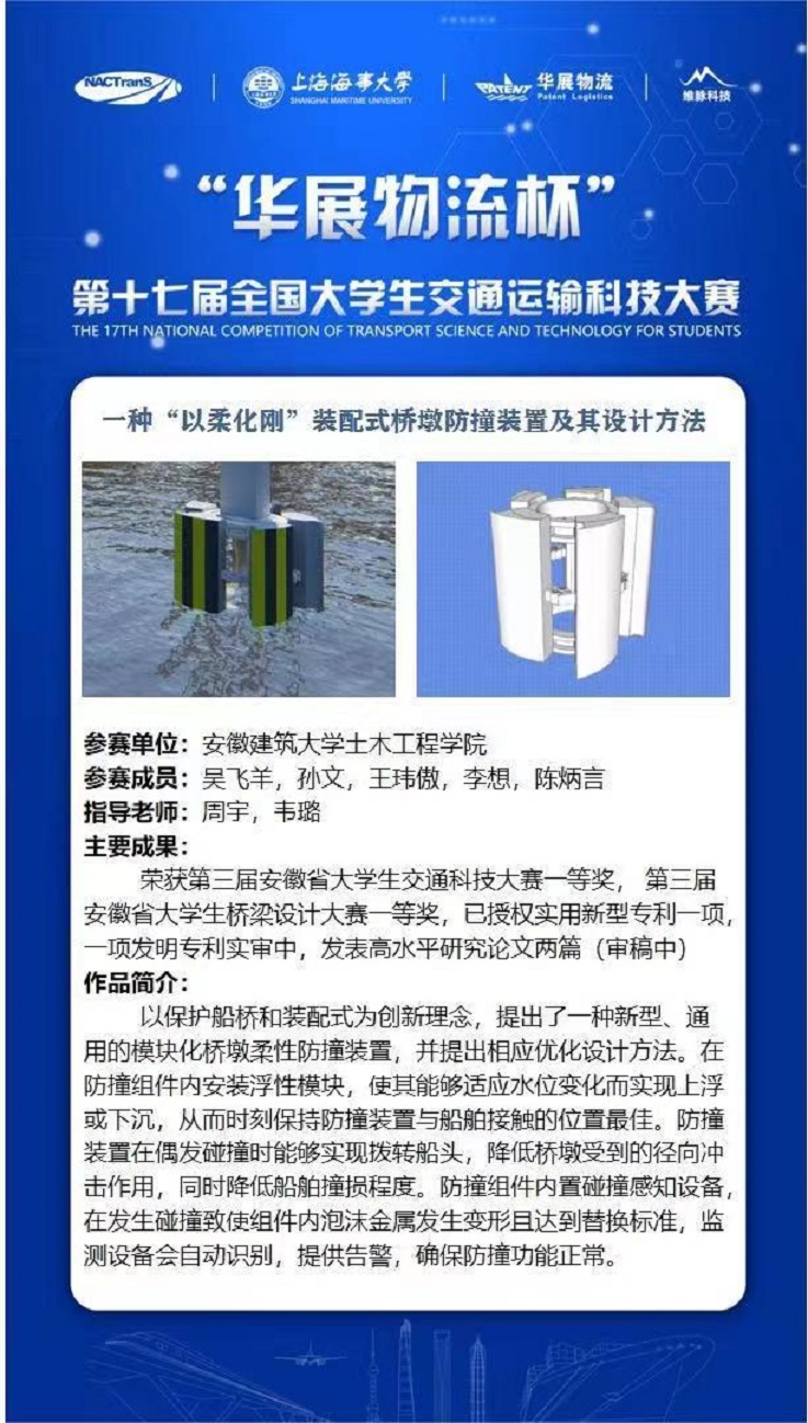 本网迅 2022年7月9日至10日,“华展物流杯”第十七届全国大学生交通运输科技大赛在上海海事大学举行。我校土木学院参赛作品《一种“以柔化刚”装配式桥墩防撞装置及其设计方法》荣获三等奖。