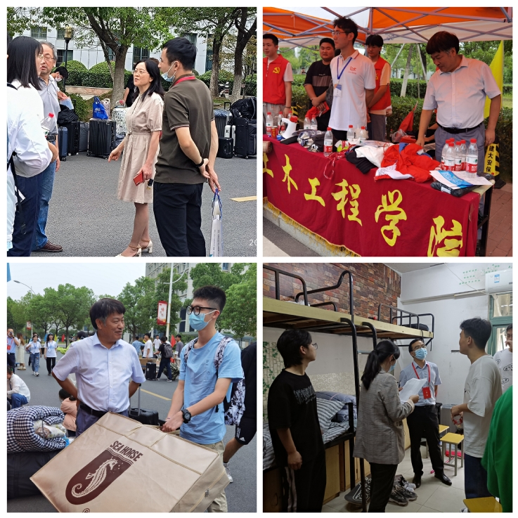 土木学院领导来到学院迎新点、走进宿舍,迎接新生,看望迎新工作人员和学生志愿者,询问实时报到数据,要求现场工作人员为新生提供优质服务,及时解决新生的困难。“家是哪里的?”“一路上顺利吧?”“住在哪个宿舍?”“对什么社团感兴趣?”院领导与新生热情交谈,给出建议和指导,勉励大家争做担纲民族复兴大任的明日栋梁。