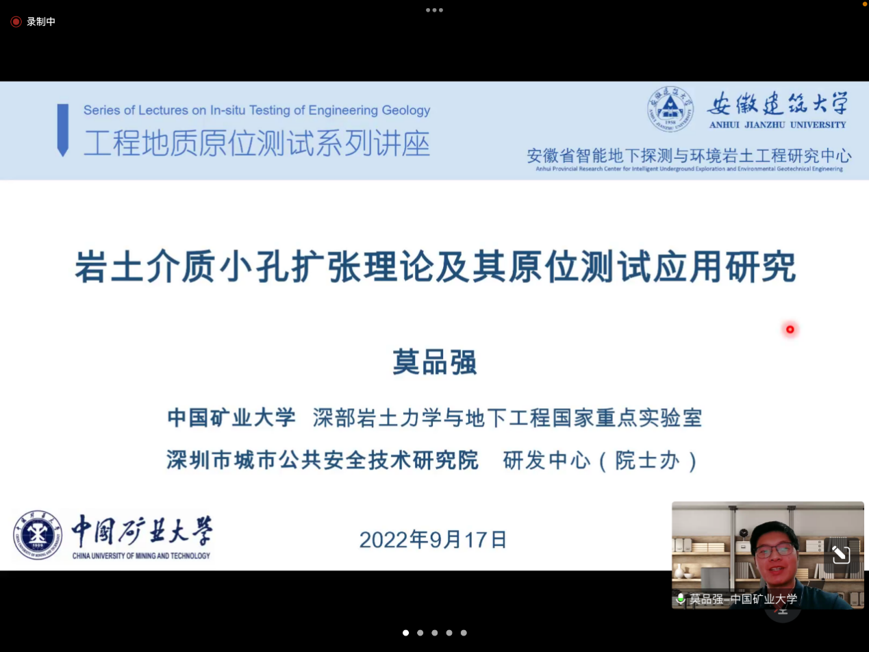 本网讯 9月17日上午由ku游官方、安徽省智能地下探测技术研究院主办的“工程地质原位测试半月谈“学术报告在线上举行。本次受邀报告人为中国矿业大学深部岩土力学与地下工程国家重点实验室莫品强副教授,智能地下探测技术研究团队全体师生参加了本次会议。报告会由ku游官方青年教师殷帅博士主持。