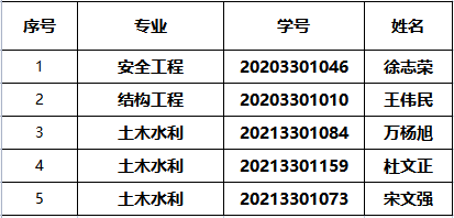 经个人申请、班级民主评议与学院审核,土木学院硕士研究生2021-2022学年国家奖学金(计5人)拟上报名单如下,现予以公示,公示期自2022年10月8日至10月12日。