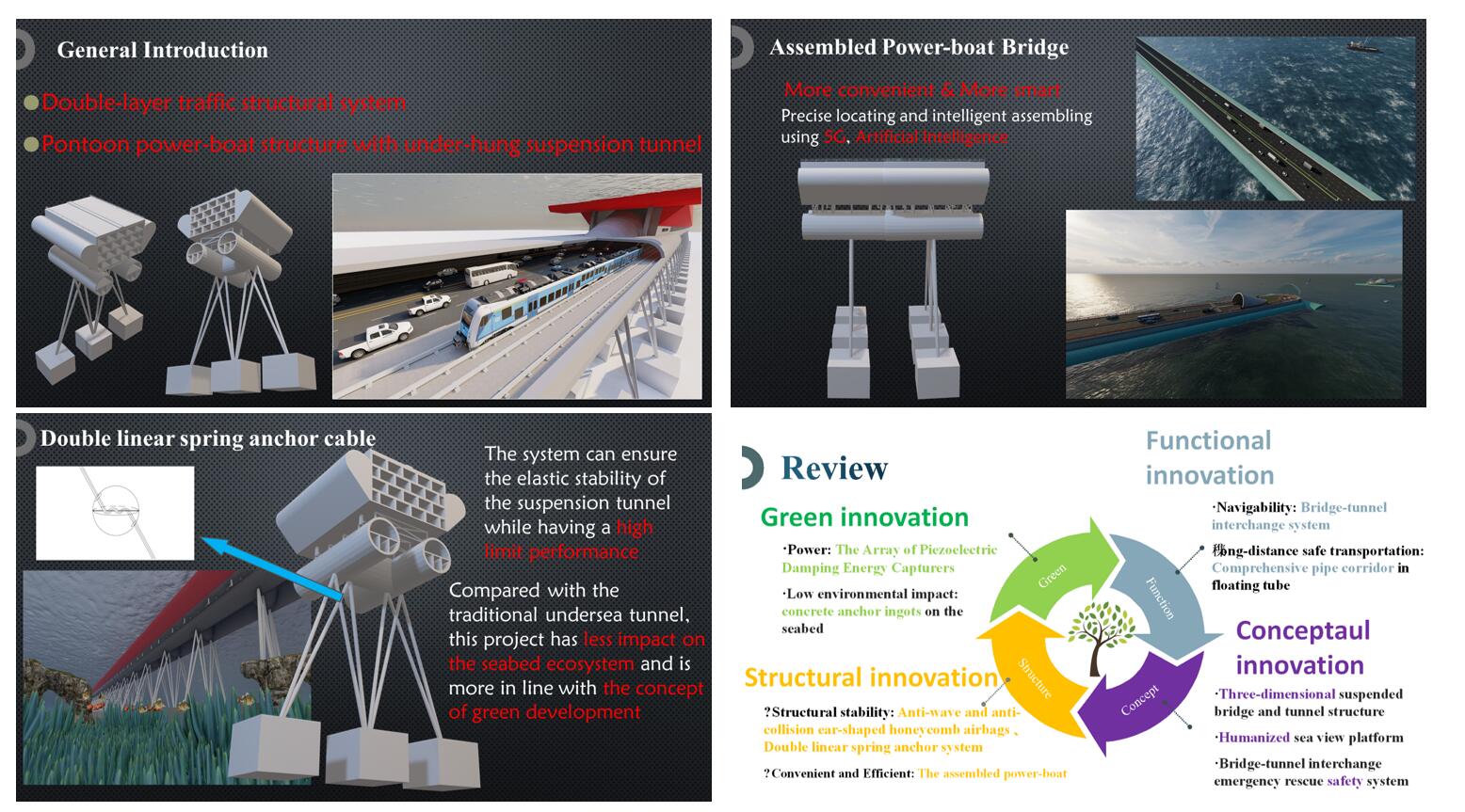 土木工程学院获奖作品以“铁路——架起’丝路’新纽带”为主题,以“数字建造”思维设计铁路及沿线城市的历史文脉延续、综合品质提升与可持续发展,旨在解决跨百公里级公铁两用跨海交通系统创新。作品结合跨海浮桥与悬浮隧道各结构优势,实现长距离跨海峡交通与海床施工低影响开发,为跨越领土内海峡建造交通基础设施,奠定技术思路与创新基础。 在疫情环境下,土木工程学院师生团队上下一心通力合作,通过高质量作品积极参与建设人类命运共同体,打造实现“绿色丝绸之路”的道桥交通基础设施,让现代科技之光照亮古老的丝绸之路,并以此稳步提升学生国际化水平、专业创新能力,营造浓郁国际化育人氛围,全面提升学生培养质量。(图/文:周宇,吴飞羊; 审核:王媛) |