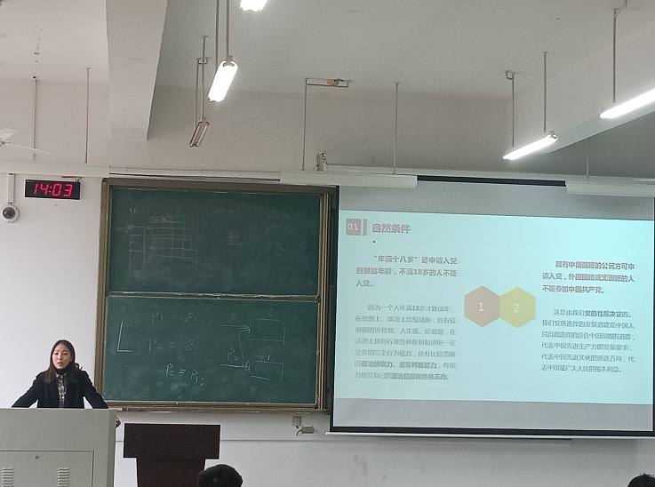 金程向同学们讲述了党的指导思想、中国特色社会主义等内容,王珊珊就入党流程及入党文书书写方面给同学们授课,周其明详细介绍了共产党员的权利与义务,王亮就《中国共产党章程》和党的光辉历程向同学们进行讲解等。丰富的内容使同学们的政治素养得到了提高,更加明确了入党的各项流程,加深了对党章党史的认识。