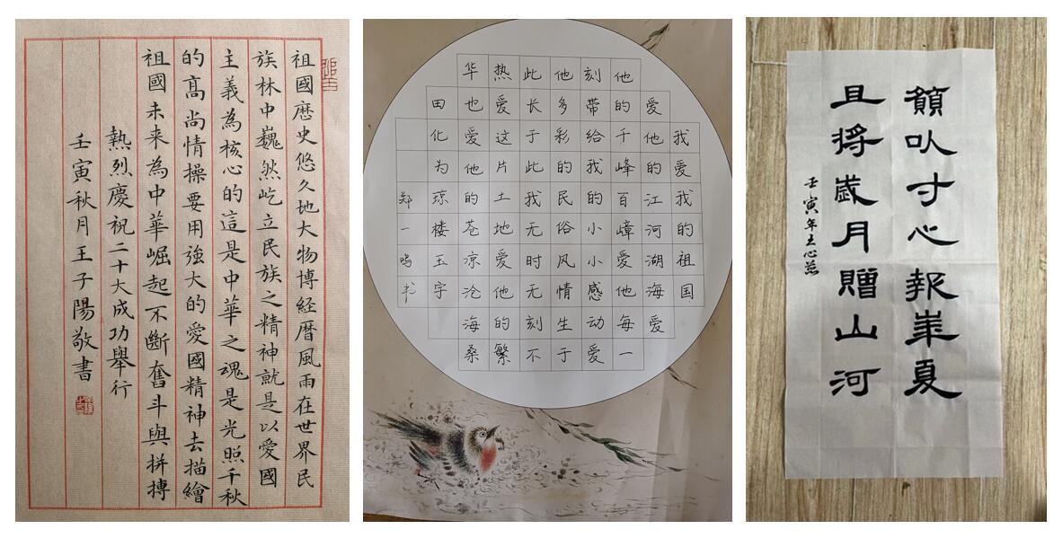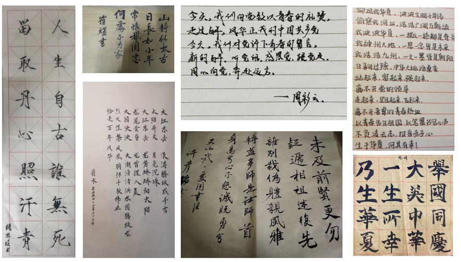 此次活动在云端开展,吸引了很多同学。大家将对祖国的感情寄托在笔墨里,书写青春朝气、讴歌伟大祖国所取得的辉煌成就。有的同学写下“不忘初心,青春朝气永在;志在千秋,百年仍是少年。奋斗正青春,青春献给党!请党放心,强国有我!”的青春誓言。光辉岁月弹指挥间,中华大地沧桑巨变。有的同学书写了“成材不负青云志,报国胸怀赤子心”的凌云壮志。有的同学表达了“小我融入大我,青春献给祖国”,吾辈星星之火亦能燎原的豪迈情怀。 青年是祖国的未来,是民族的希望。本次活动进一步增强了广大学生的使命感、荣誉感、责任感,激励他们以信仰之光照亮前行之路,以实干笃定前行,以奋斗开创未来。(图/文:王月竹,陈一航,张明宇;审核:王媛) |