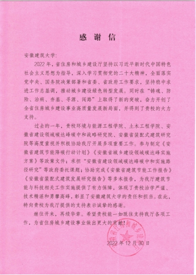 本网讯 近日,我校收到安徽省住房城乡建设厅发来的感谢信,着重强调了我院和安徽省装配式建筑研究院科研平台过去一年在推动住房城乡建设事业高质量发展中做出的贡献以及展现出的优良工作作风和专业工作水准给予了高度肯定。