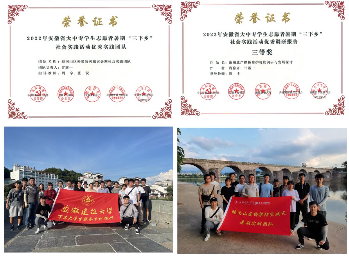 本网讯 2022年,土木学院在校团委的支持下顺利组织并开展了以“永远跟党走,奋进新时代”为主题的大学生暑期“三下乡”社会实践活动,其中,“皖南桥梁防灾减灾”暑期实践团队在2022年安徽省大中专学生志愿者暑期文化科技卫生“三下乡”社会实践活动总结中,荣获暑期“三下乡”社会实践活动优秀实践团队(负责人:甘露一,指导教师:周宇、张锐),团队撰写的《徽州遗产拱桥修护现状调研与发展探讨》(作者:尚稳齐、甘露一,指导教师:周宇)获得优秀调研报告三等奖。
