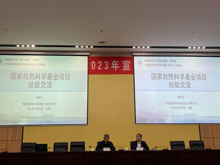 本网讯 4月27日下午,由校党委宣传部主办,安徽省智能地下探测技术研究院、ku游官方土木工程学院承办的第94期“易海大讲堂”在南校区实验综合楼二楼报告厅举行。中国地质科学院地质力学研究所裴军令研究员做客“易海大讲堂”,并做题为《国家自然科学基金项目经验交流》的报告,会议由校党委常委、副校长蔡国军教授主持,土木工程学院执行院长张宁教授、副院长陈东教授、安徽省智能地下探测技术研究院老师出席大会。 裴军令研究员首先介绍了新时代、新形势下科学基金资助导向以及目前我国基础科学研究存在的问题和差距,重点指出交叉学科是我国科技研究类项的问题导向、是面向国家重大需求和经济主战场、是加强前沿技术基础研究,解决需求背后的核心科学问题。其次,从申请者、管理者和评审者三个不同角度对项目申请类型、选题特点等多方面进行详细分析,剖析了近年来各类基金资助情况以及基金评审过程的特点。最后,他结合着自己的申请和多年的工作经验,强调在申请项目书时把握好定位和创新性研究,抓住评审专家的特点,才能提高国家基金项目申报的成功率。
