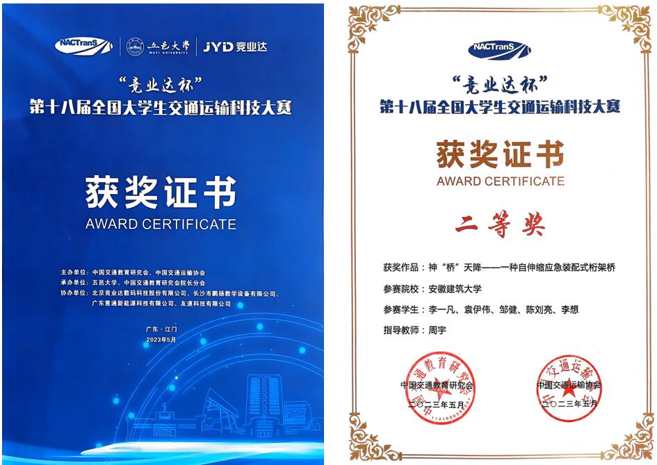 本网讯 5月27-28日,“竞业达杯”第十八届全国大学生交通运输科技大赛在广东省江门市五邑大学举行。我校土木学院参赛作品《神“桥”天降——一种自伸缩应急装配式桁架桥》荣获二等奖。