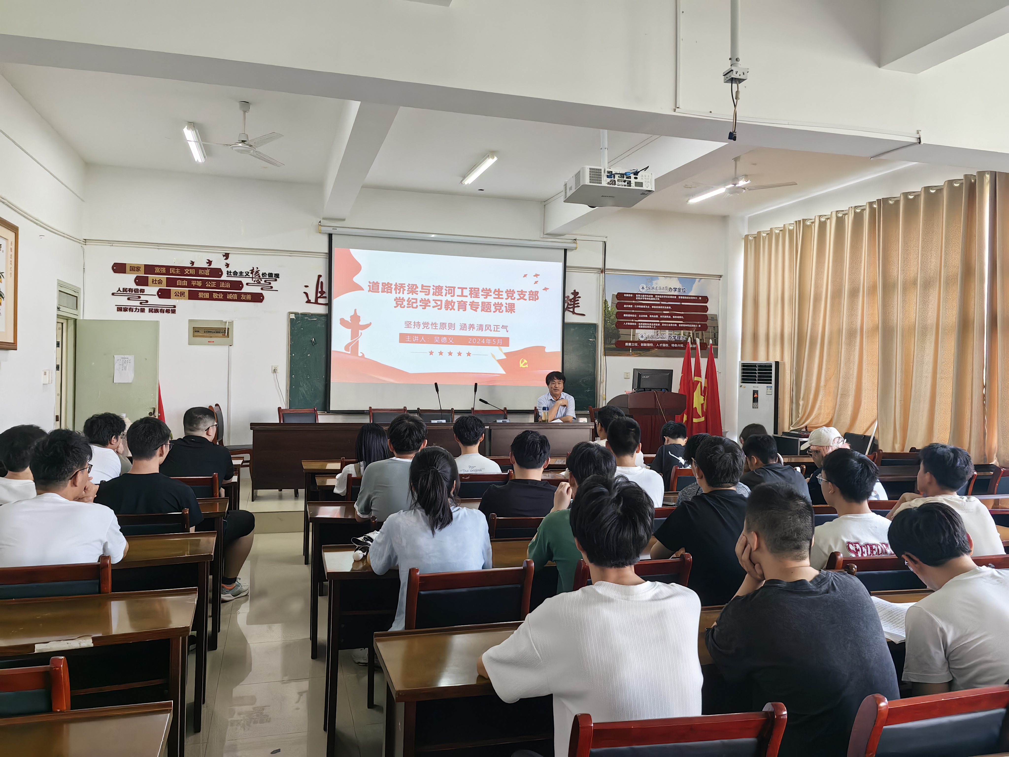 本网讯 为深入开展党纪学习教育,强化学生党员纪律意识,进一步严明党的纪律规矩,按照学校党委部署要求和学院党委工作安排,5月25日下午,土木工程学院院长吴德义在徽匠楼三楼会议室为道桥学生党支部全体党员讲授党纪学习教育专题党课。