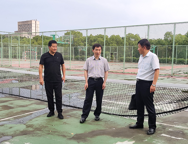 本网讯 为积极推进高校公共体育俱乐部制教育教学改革,加强体育场地设施建设,保障体育教学和训练活动正常开展,7月7日下午,副校长成祖德实地走访体育教学部,对学校体育运动场地建设进行实地考察,并对网球项目的具体问题给以调研指导。后勤服务集团总经理戴前宏和体育教学部副主任徐飞随行调研。
