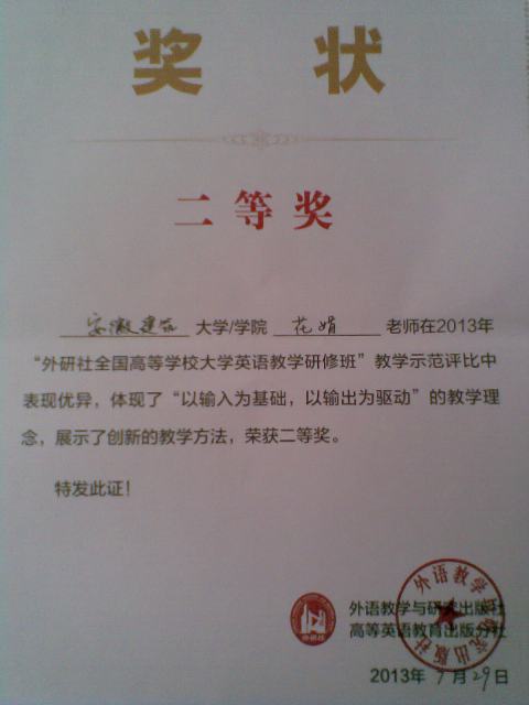 本网讯 7月28-31日,由外研社主办,2013年度全国高等学校大学英语教学研修班教学示范评比在西安举行,由哈工大、中国政法大学等全国40余所院校选拔的100余名优秀选手参加了比赛。经激烈竞争,我系翟宇卉、花娟老师分别荣获一、二等奖。