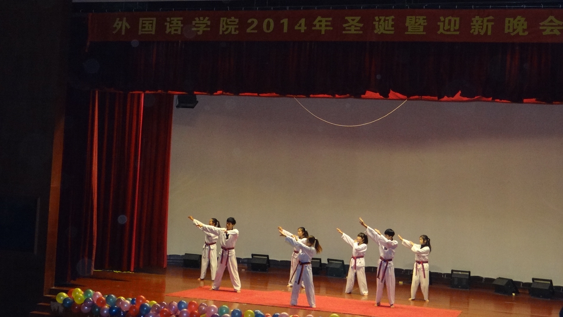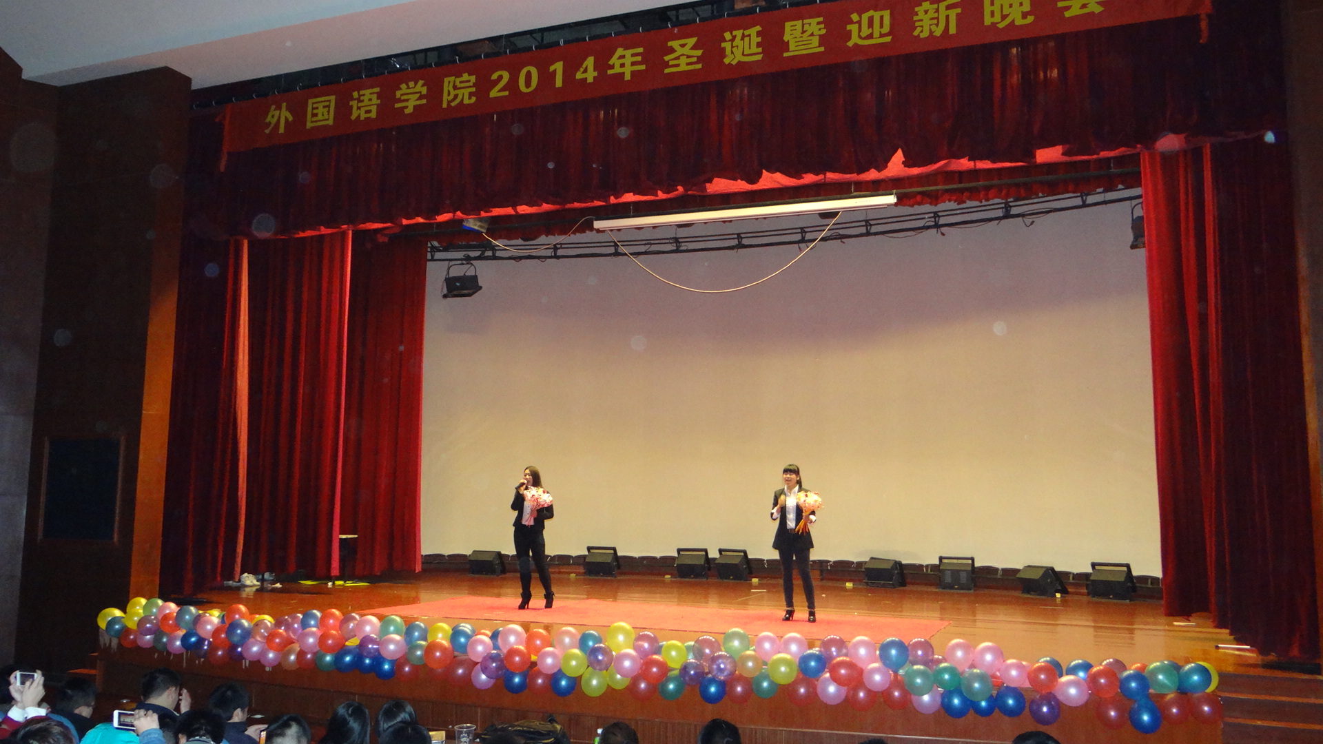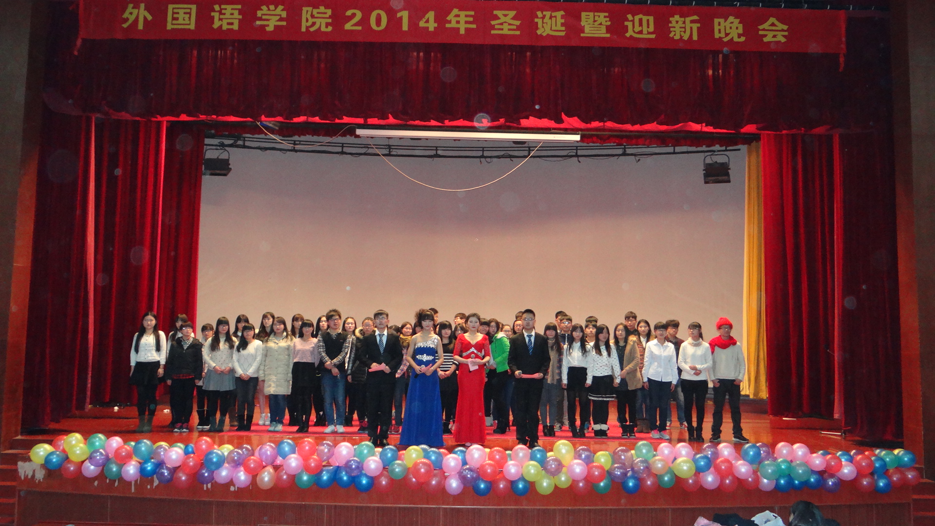 本网讯 2014年12月20日晚上6:30,第五届校园社团文化节系列之2014年圣诞暨迎新晚会在校大学生活动中心隆重举行。本次晚会由外国语学院团总支、学生会承办,外国语学院英语俱乐部协办。全校近400名同学前来观看了晚会。