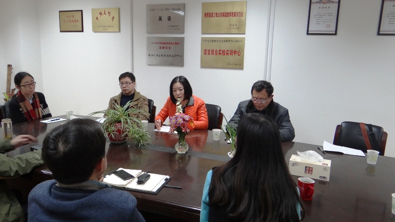 下午,调研组走访南林大,与外院领导班子举行座谈。教育部大学英语教学指导委员会委员肖飞教授就该校大学英语“一校多纲”理念教学模式及最新修订版《大学英语教学指南》,与调研人员进行热烈交流与探讨。随后,在院领导陪同下,调研组参观了该院自动录播实验室、日本文化情景体验室、同声传译实验室、SANAKO网络化数字实验室等特色实验室,并就大学英语实验中心建设进行了互动交流。