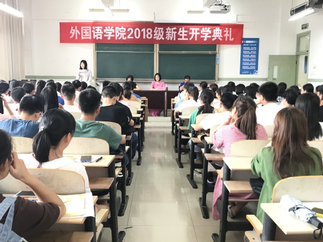 本网讯 9月7日下午,外国语学院分别在主教学楼1603教室和1718会议室召开了2018级新生开学典礼、家长见面会。外国语学院党政领导、辅导员、老生代表、以及18级全体新生和部分家长出席了开学典礼。会议由党总支副书记余鸿主持。