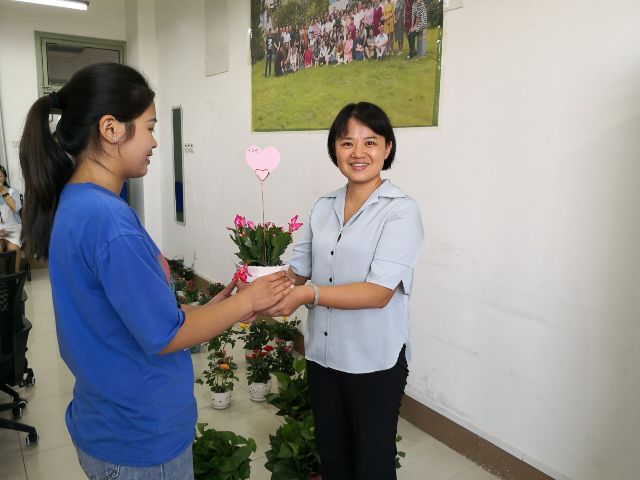学院负责人和各位同学,将一盆盆叶繁花茂、姹紫嫣红的康乃馨、欧月季、长寿花、蟹爪兰、白鹤芋、九里香送至一线教师手中,并送上亲手书写的卡片,向老师们致以节日的祝贺与问候。花海之间,笑语欢声,教职工在愉悦的气氛中,欢度第三十五个教师节。(文/图:陈晋;审核:林莉兰 )