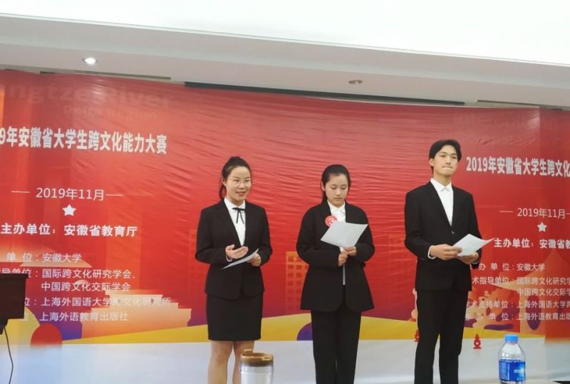 本网讯 近日,由安徽省教育厅主办、安徽大学承办的2019年度安徽省大学生跨文化能力大赛在合肥举行。外国语学院对备赛工作高度重视,先后组织数场校内初赛,选拔出来自学校英语专业、环境生态专业的操逸凡、马馨雨、何锦瑞三位优秀选手组成代表队,最终代表学校获得三等奖。(文/图:吴纬芳 唐贝贝;审核:徐春山)