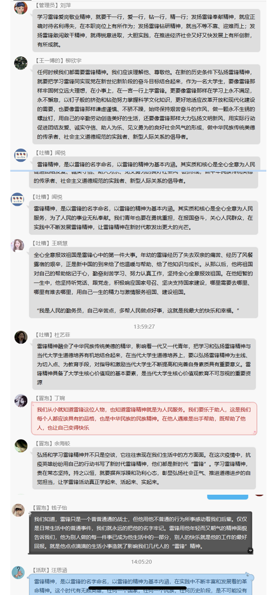 开展“践行雷锋精神助力疫情防控”线上主题团日活动。活动中,各团支部依托QQ班级以文字、链接等方式,带领支部团员线上重温雷锋事迹,学习雷锋精神的时代内涵及疫情防控的相关知识,分享在抗“疫”中的所思所感,传播青春正能量