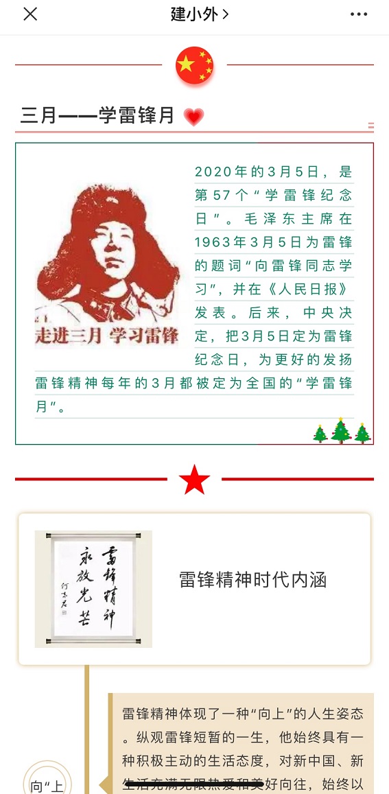 发布雷锋主题推文,传承雷锋精神外国语学院利用微信公众号QQ工作群等多个渠道,向广大青年学生发出向雷锋同志学习的倡议,大力宣传雷锋同志的先进事迹和雷锋精神。