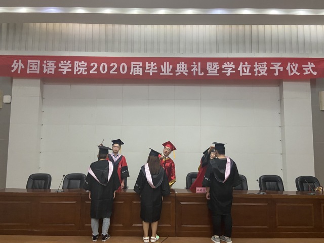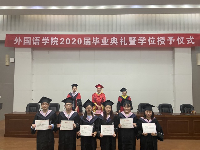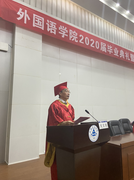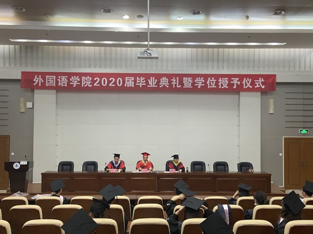 本网讯 7月3日,外国语学院2020届毕业典礼暨学位授予仪式在校图书馆报告厅举行。校长孙道胜出席,外国语学院负责人、毕业班辅导员和2020届毕业生济济一堂,共襄荣典。