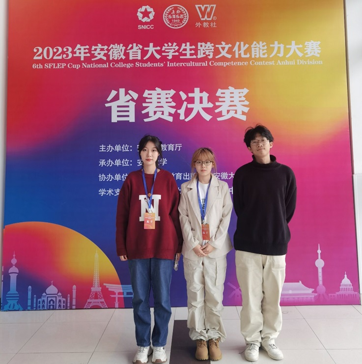 本网讯 2023年第六届安徽省大学生跨文化能力大赛于11月12日圆满拉下帷幕。我校外国语学院的三位优秀导师:唐贝贝、吴纬芳、李倩亲领来自英语、艺术专业的三位学生:袁思博、陈嫄、王可心参加比赛。领队教师倾心指导,学生耐心打磨。她们一路披荆斩棘,终夺得桂冠,取得省一等奖的好成绩。