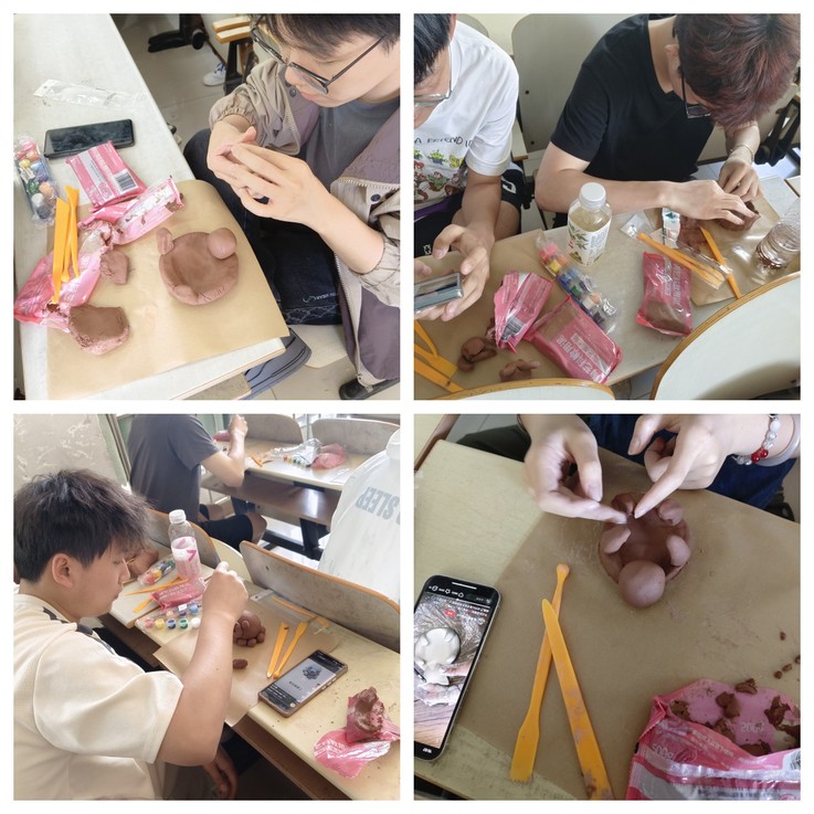 学院在活动引导阶段,准备了丰富的手工材料,并通过教学视频和成品图片提供一些简单的泥塑砖雕技巧和示范,向同学们介绍了一些基本的制作技巧,如揉泥、捏泥、刻画等。创作阶段,同学们根据自己的喜好和主题进行泥塑创作,使用各种工具和技巧来塑造、复刻自己喜欢的泥塑作品。大家沉浸在创作的美好体验中,经过两个小时的努力,一件件形态各异的陶艺呈现在同学们的眼前。最后,大家将自己完成的作品上色、修饰并公开展示,合影留念。通过相互欣赏交流、学习借鉴,同学们都对泥塑砖雕创作有了一个更好的理解和把握。