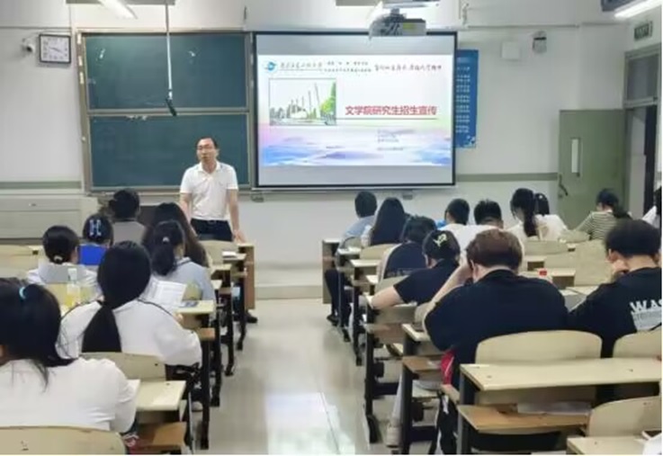 外国语学院党总支书记余鸿对郭雨一行的到来表示欢迎。双方就党建工作开展、师资队伍建设、毕业生就业等方面进行了深入交流,分享了各自的工作经验和成果。会谈结束后,余鸿等陪同郭雨和郑友奇参观了我校校史馆。随后,在考研宣讲会上,郭雨围绕南京信息工程大学学校校情、学院概况、专业方向、人才培养、就业去向、招生政策等方面进行了总体介绍;郑友奇重点宣讲了南信大文学院的研究生培养方案、课程设置、导师队伍以及研究生就业前景等,并为同学们提供了一些备考建议和方法,帮助大家更好地应对考研挑战。在互动问答环节,宣讲团队耐心解答了同学们的问题,并给出了具体的建议和指导,鼓励同学们要坚定信心、勤奋努力,以最好的状态抓住机遇、迎接挑战。到场同学均表示获益匪浅。
