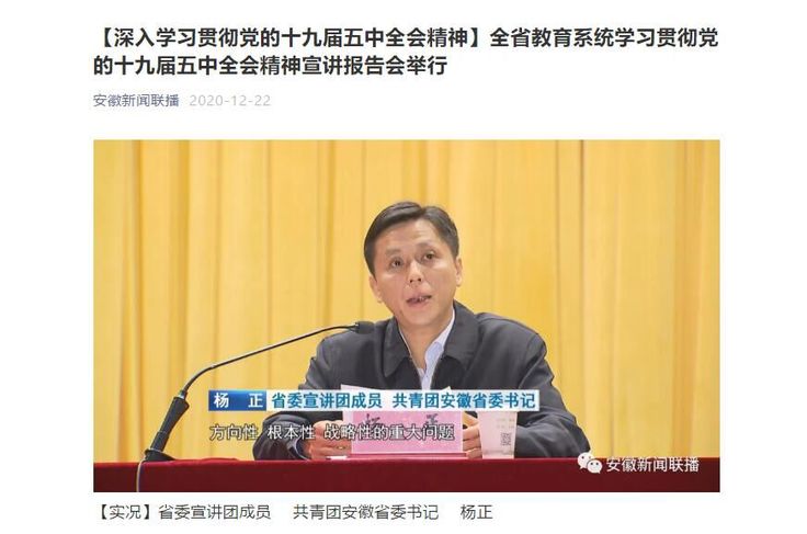 编者按:12月4号上午,省委宣讲团成员、团省委书记杨正来在安徽农业大学,向在肥大中专院校师生代表和合肥市中小学教师代表宣讲党的十九届五中全会精神。我校团委书记唐志敏参与了会议并接受了采访。12月22日,安徽新闻联播对此进行了报道。
