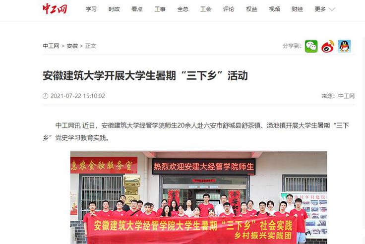 编者按:近日,我校经管学院师生20余人赴六安市舒城县舒茶镇、汤池镇开展大学生暑期“三下乡”党史学习教育。7月22日,中工网对此进行了报道。