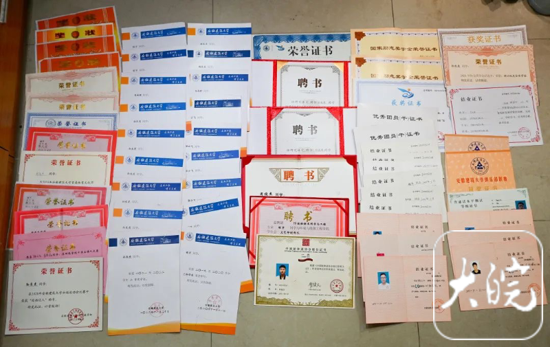 大学四年,六人留下的还有数不清的奖状和证书:2023年安徽省省级优秀毕业生、校级优秀毕业生、“互联网+”高校主赛道银奖、“深水杯”定向专题竞赛优秀奖、中骐-华旭杯省级一等奖、国家励志奖学金、校级奖学金、社会奖学金、三好学生、优秀学生干部、优秀团干、优秀团员、优秀志愿者……他们大学期间取得的证书和荣誉,几乎可以铺满整个宿舍的地面。