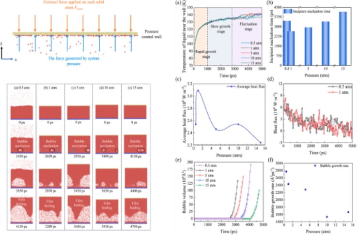 研究中定量给出了不同系统压力下核沸腾过程中的气泡动力学、界面演化及成核能垒,揭示了压力影响的内在机理,结果表明初始成核与体液层中势能的变化有关。本研究为核沸腾分子动力学模拟提供了一种有效的压力控制方法,为复杂压力环境下的沸腾相变传热研究提供参考,对能源、航天、电子等领域高效换热器件研发具有一定指导意义。(作者:胡浩威 审稿:谢发之)