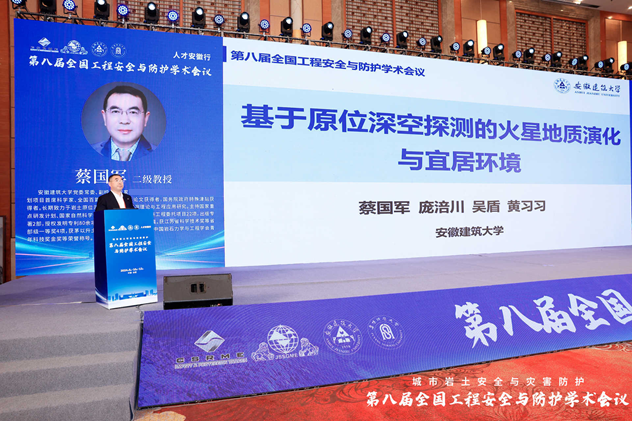 大会特邀报告环节由同济大学朱合华院士、北京建筑大学戚承志教授、南京大学施斌教授、南京理工大学何勇教授、中国科学技术大学纪杰教授、阜阳师范大学方廷勇教授、河海大学朱珍德教授和武汉大学罗忆研究员分别做题为:“智慧基础设施数字底座建设及其实践”“颗粒介质受载力链演化的力学模型”“岩土体灾变感知与应用”“新型爆炸毁伤与韧性防护技术”“隧道火灾烟气流动特性及控制方法”“城乡建设安全发展“安徽模式””“极端环境下干热岩体渗流网生成智能演化理论研究”与“复杂应力路径下双江口花岗岩破坏特征及能量演化机制”的大会报告。