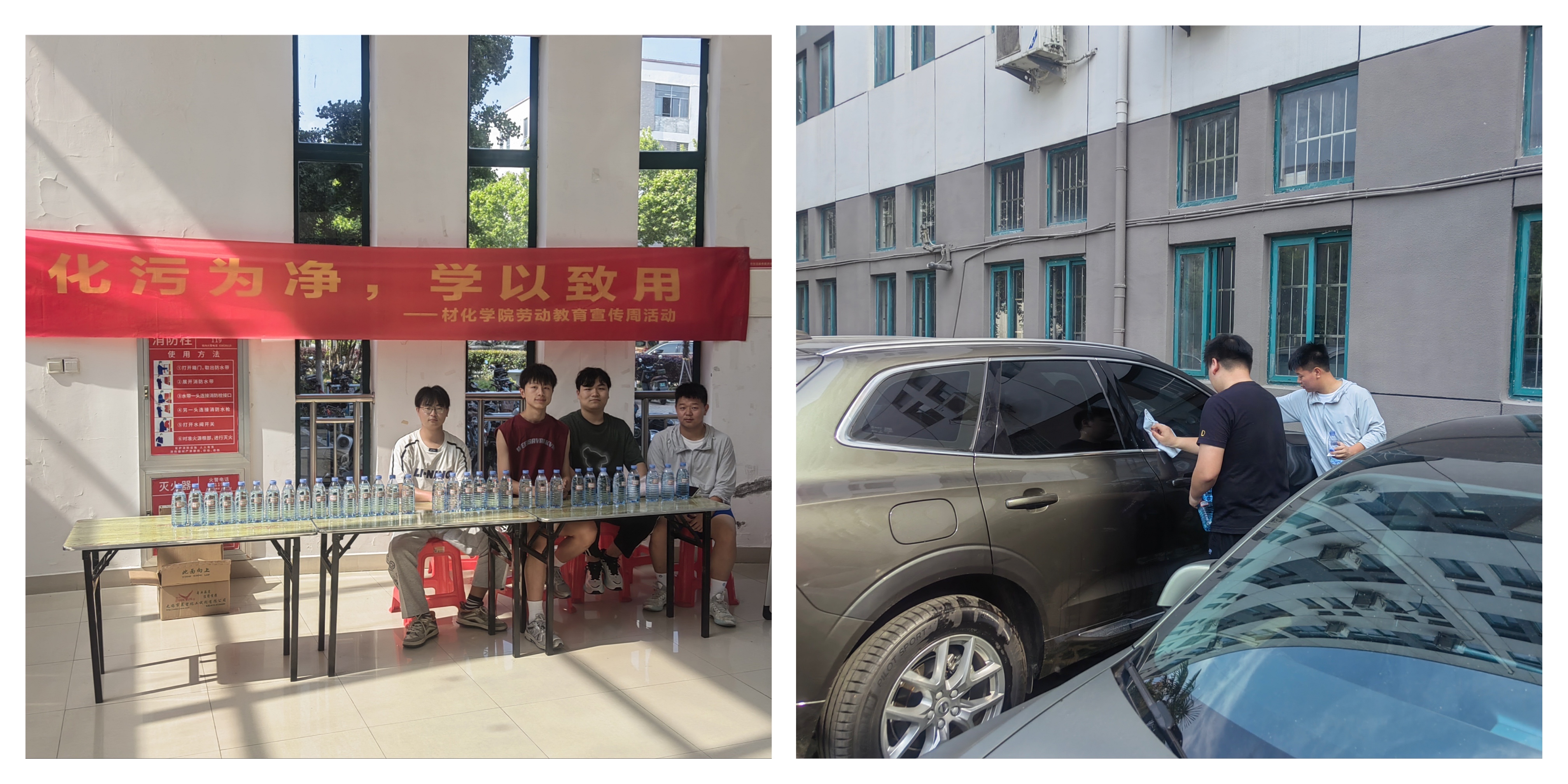 化污为净,体味劳动快乐。劳动育人,鼓励学生动手实践、出力流汗、接受锻炼、磨炼意志,在劳动实践中发现真问题,解决真问题。5月10日,材化学院组织学生开展“自制玻璃水,免费擦玻璃”的公益服务活动。志愿者们用自己配制的玻璃水帮助清洁车窗玻璃、门窗玻璃等,并在徽华楼一楼大厅免费赠送玻璃水。有了自制玻璃水的加持,学生们干劲十足,先用浸透玻璃水的抹布仔细擦除灰尘和污渍,又用拧干的抹布擦去水痕,细致地把每一块玻璃都擦得明光铮亮。在活动过程中,学生们也十分感慨,擦玻璃看似简单,想做到极致也是需要付出很大的努力。看着焕然一新的玻璃,同学们深切感受到了劳动的快乐,感悟到了“劳动创造幸福生活”。