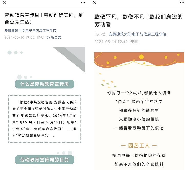 培根润心,将劳动教育融入思政教育。学院依托网站和微信公众号开设专题专栏,推出图文和海报等,开展思想政治教育,宣传劳动榜样和身边劳动者事迹,加深学生对劳动的正确认识与理解,引导学生以勤奋劳动成就梦想,以诚实劳动铸就辉煌,以智慧劳动续写荣光,传承与弘扬劳动精神,为新时代的发展贡献力量。