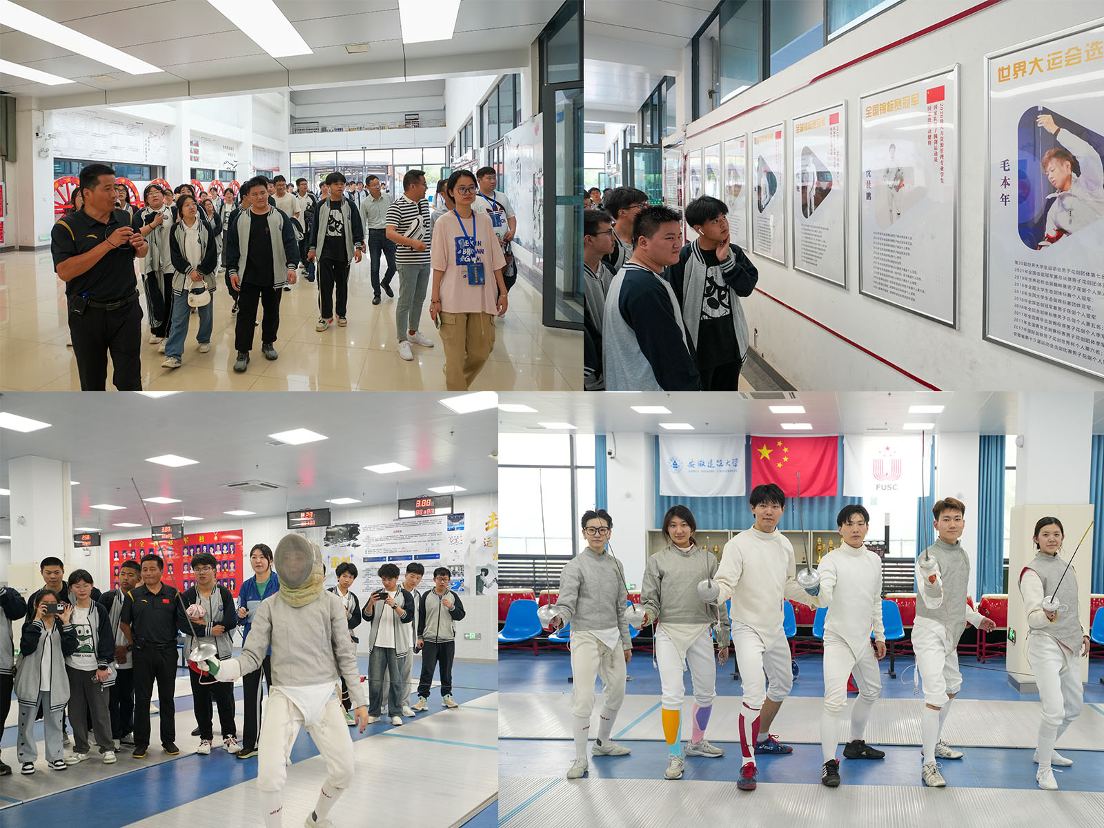 踏入学校体育馆,校体育部负责人亲自陪同讲解,向严桥中学师生一一介绍学校近年来打造的徽州龙舟、轩辕车会等兼具地方文化特色与民俗体育趣味性的教学项目。击剑馆里,同学们观摩了学校高水平运动队成员分花剑、佩剑、重剑三组开展的日常训练,在教练指导下体验击剑、握剑、刺、劈,防守等技巧动作,对全国冠军榜上建大学子的摘金夺银事迹发出深深赞叹。