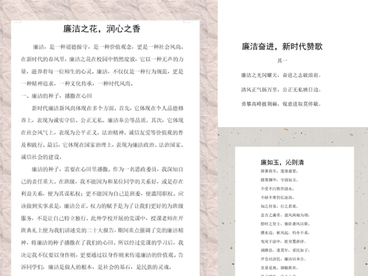 开展“以文育廉,涵养时代新风”的征文活动,同学们从历史故事、先进典范、成长经历、家国情怀等角度立意,撰写诗歌、散文、随笔等文章。本次征文活动旨在引导大学生树立正确的世界观、人生观、价值观,推动形成以清为美、以廉为荣的廉洁校园文化氛围。