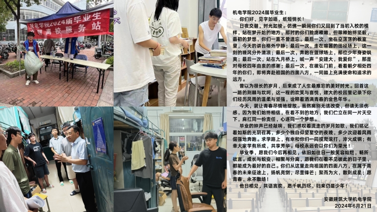 “温情送别,暖心护航”行动。学院班子成员、毕业班辅导员们深入宿舍与毕业生亲切交谈,对他们的毕业、就业及返乡等情况进行了详细了解,叮嘱学生回家注意安全,勿忘母校,常回校看看。