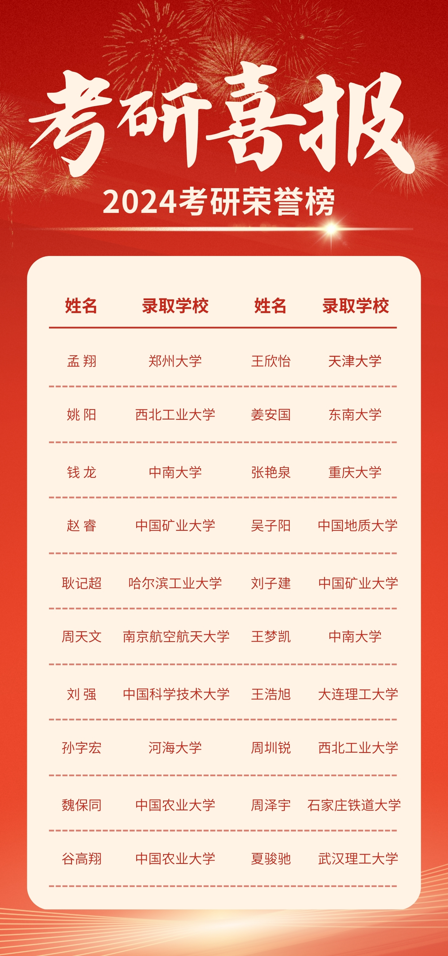 一腔热血凌云志,乘风破浪少年行。在今年的考研与就业工作中,土木新工科方向取得了骄人的成绩——30名同学中20名同学报考研究生,20名同学被录取为研究生,考研率为66.67%,其中19名同学被中国科技大学、东南大学、哈尔滨工业大学、西北工业大学、天津大学、中南大学、大连理工大学、重庆大学、中国农业大学等985、211高校录取,录取率为63.33%。1名同学成功上岸国家公务员。8名同学任职于中国建筑、中煤建设等大型国央企。四年来,同学们笃行不怠、满怀希望,脚踏实地、奋力生长,用努力和汗水为大学时光画下了美好句点。