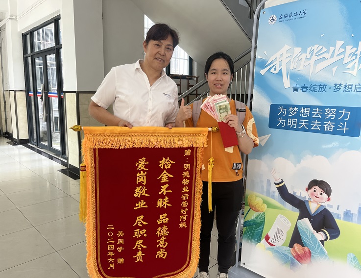 宿舍全员离校后,公寓管理员即两人一组,对毕业生房间进行检查,以便后续的保洁及维修。在检查中,捡拾到笔记本电脑、平板电脑2台,现金2000余元,价值6000元的手镯一个,身份证等证件3张,学位证等其他荣誉证书2张。工作人员通过电话联系、同学联系、上报学院等方式,寻找失主,为减少学生来回奔波,通过邮寄、手机转账等方式将财物归还,受到了学生的一致好评,收到学生感谢锦旗2面。